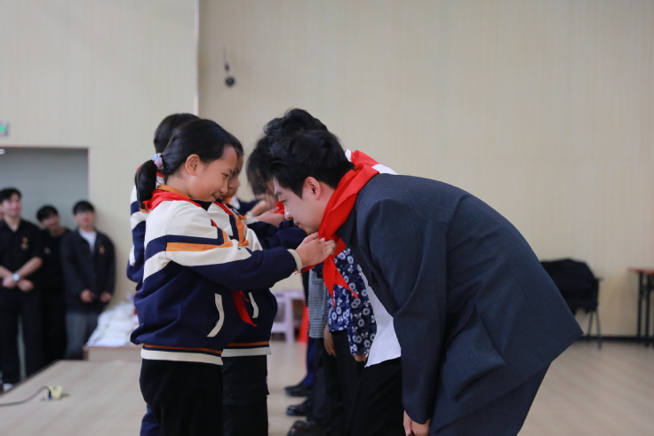 话剧落幕,少先队员代表整齐列队郑重为演员们系上红领巾。胸前那一抹鲜红随风轻扬,犹如精神的传递,凝聚着新一代对历史的敬仰与对家国的担当。《我们是共产主义接班人》的激昂合唱将活动推向高潮。